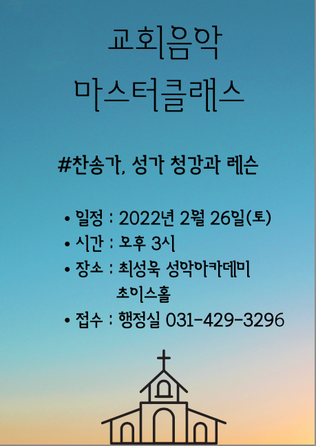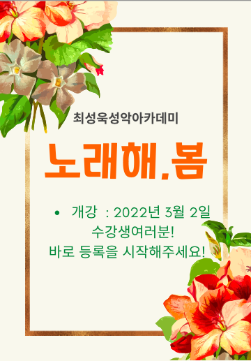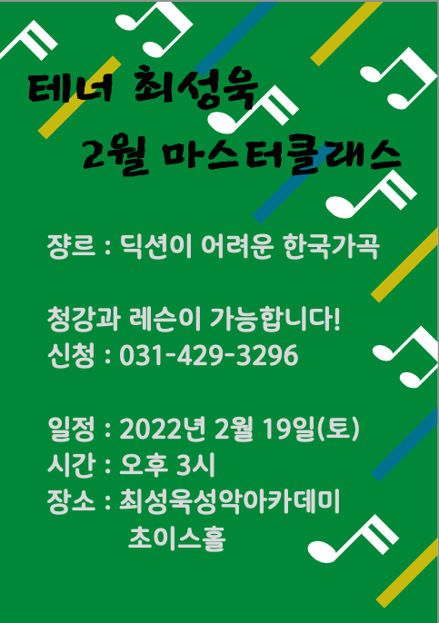 2022 봄학기 최성욱 성악아카데미 등록안내 새로운 시작! 3월부터 시작하는 성악아카데미 ! 고품격 럭셔리 성악레슨이 찾아옵니다! 3학기 / 대상 : 1기 수강생 독일가곡 수료자 학사 일정 2022년 3월 2일 - 6월 29일 연주 실기연주회 2022년 7월 2일 (토) 가곡 1곡, 아리아 1곡 리허설 레슨 개인레슨 총 16차시 / 담당교수 레...