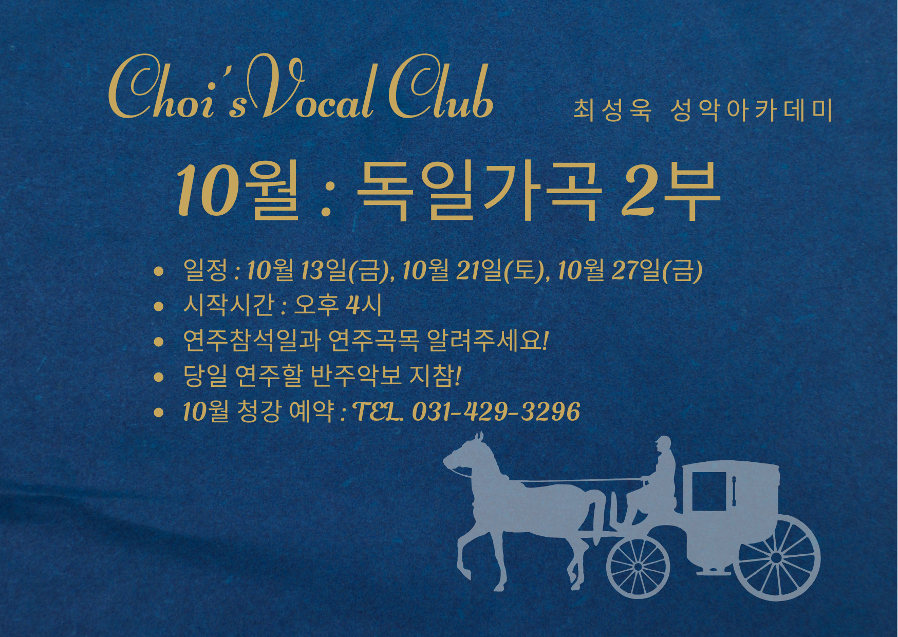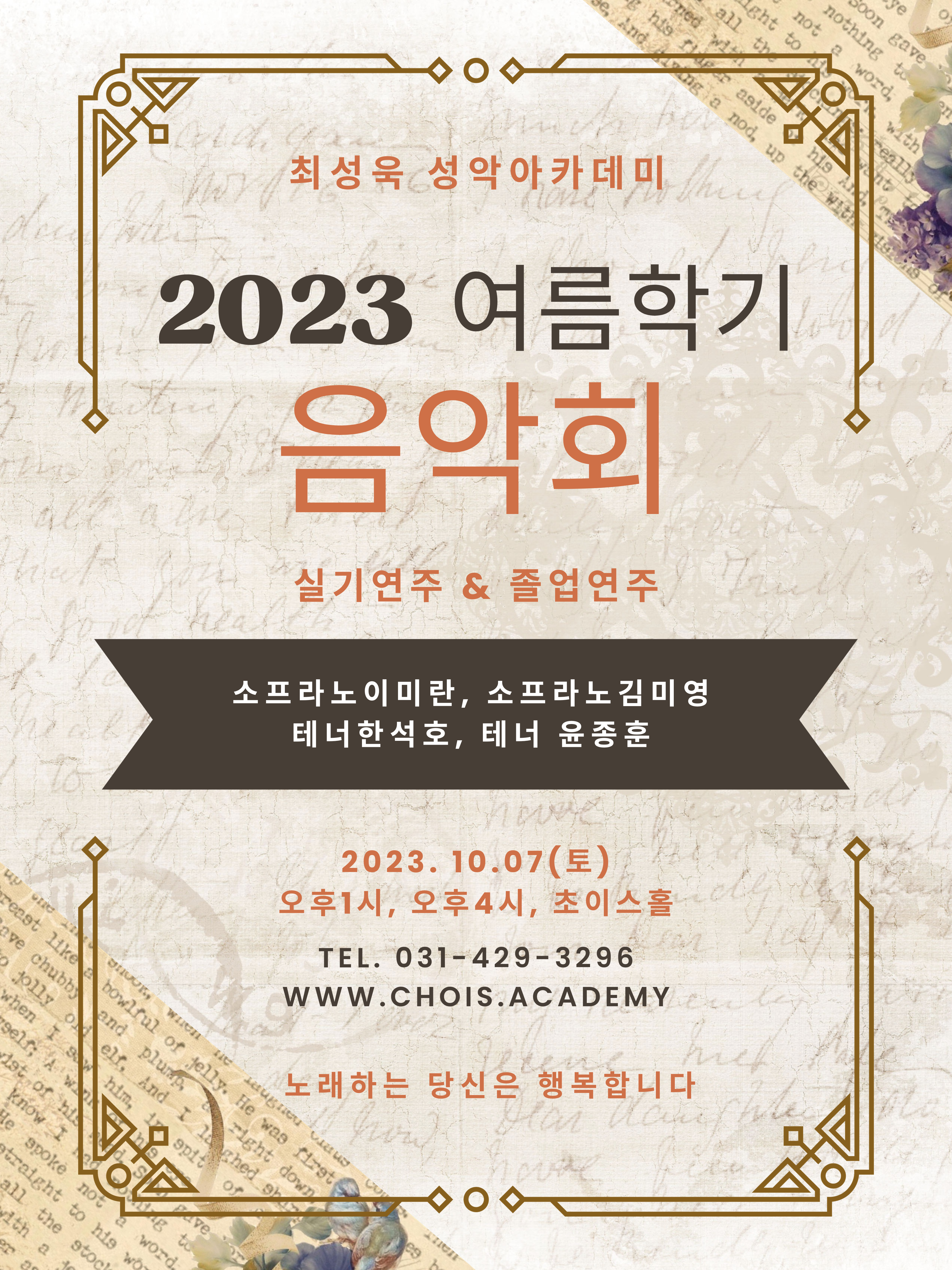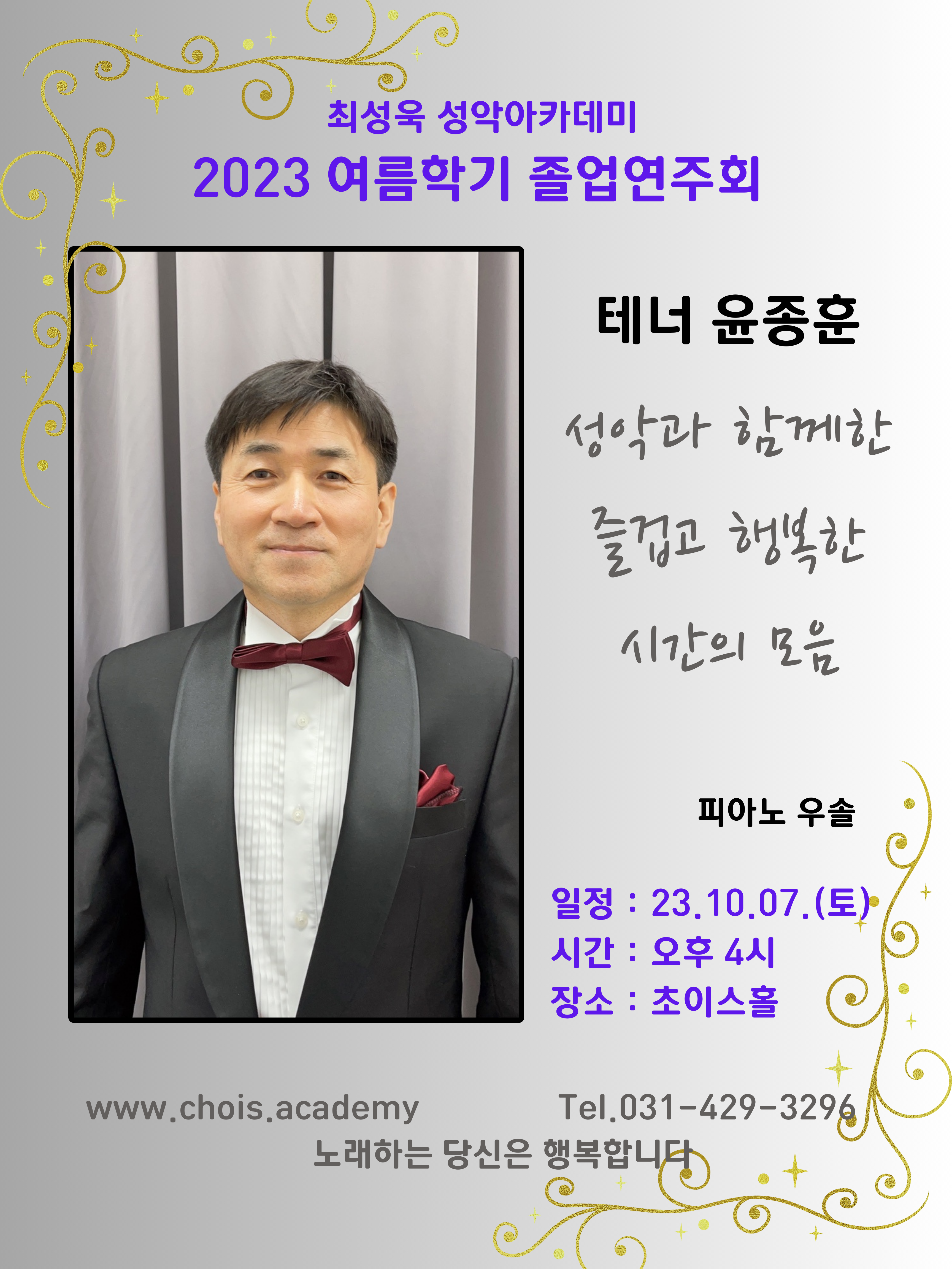 2023 가을학기 신규 아카데미 수강 안내 수강방법 : 행정실문의 031-429-3296 / 홈페이지 메뉴 수강신청 선택하여 작성 후 등록보내기 완료 학기제 아카데미 가을학기 학사일정 1. 기간 : 2023년 10월 18일 ~ 2024년 1월 27일 2. 위클리 : 2023년 12월 2일(토) 오후 3시 3. 실기연주회 : 2024년 2월 3일(토) 시간 추후 공지 ...